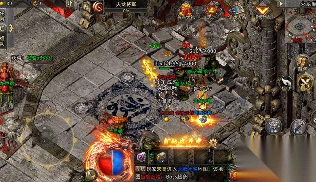 1、今天小编给大家带来一期火龙单职业的教程,火龙单职主要是玩法多,火爆的人气,超高清的画质,万人百战的战场。好了言归正传。 2、刚开始新手接触这个版本的传奇肯定是有点懵的,这边小编就给大家慢慢讲,首先这边是建议大家可以首冲一个六块钱也是比较划算的,送的东西也多,这样就有人会问哪有一开始什么都不知道就往里面砸钱,没事,不充也可以,无限的副本随便刷,大厅还有泡点升级,站着不动挂机都可以升级让你直接升到52级,要是还是觉得升级不够快的话可以在下方有一个押镖的地方去押镖,升级也是非常的快的。