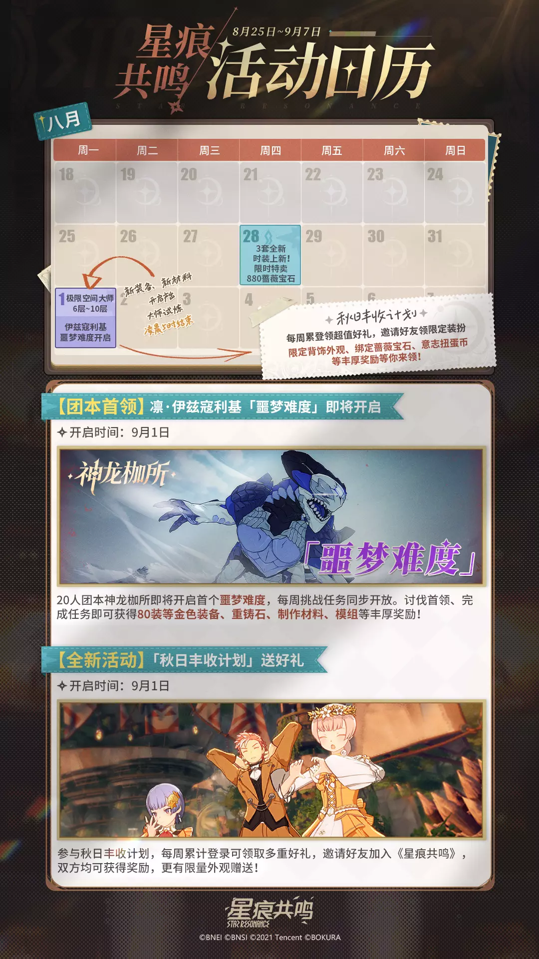 神龙枷所噩梦难度开放在即,冒险者完成每周挑战任务即可领取丰厚奖励;秋日丰收特别活动也已提上日程,多重好礼与限定外观等你来领!