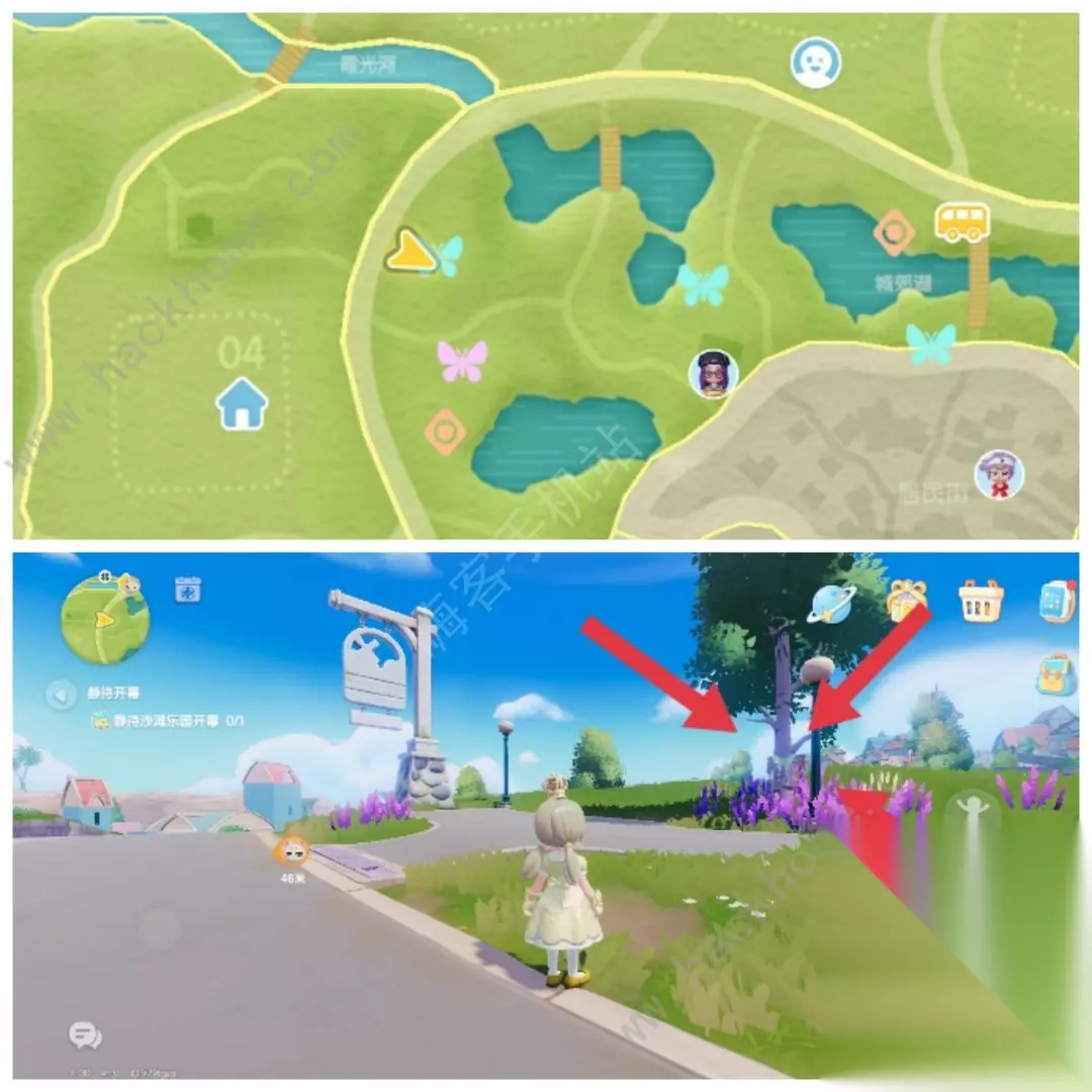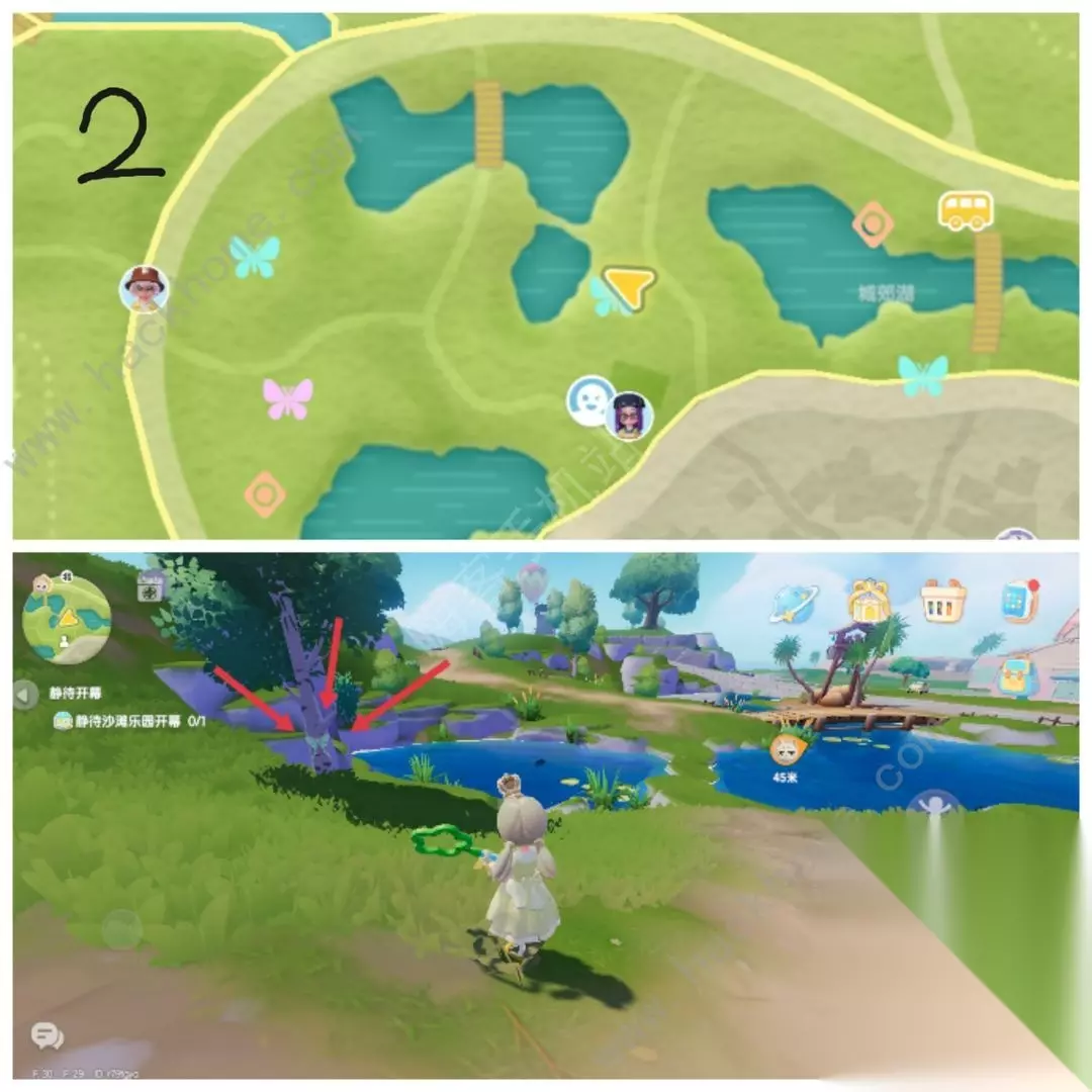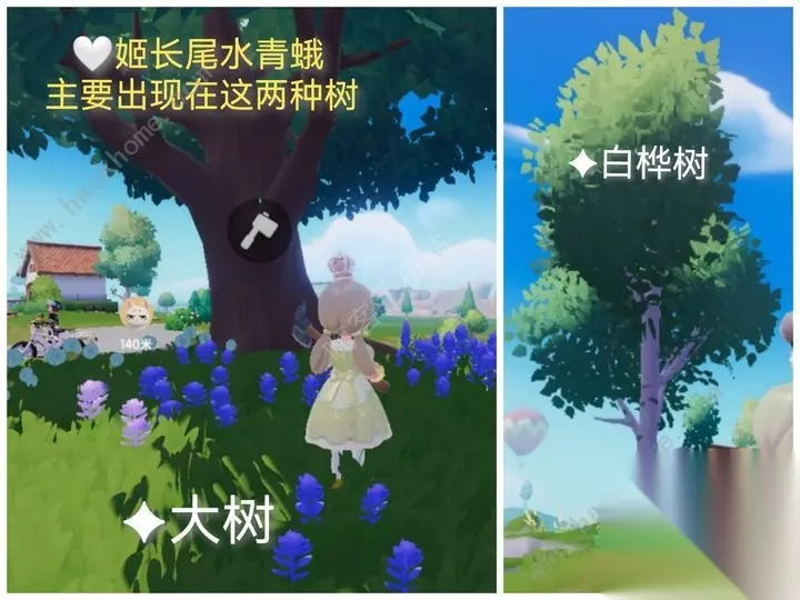 抓前请看点位说明(图3):姬长尾水青蛾喜欢趴在树干上,请认准这两种树。趴在大树上会穿模,而且泡泡会打到树干上,可以先惊动它再抓。 刷新点1在地图[霞光河]下方,这个招牌旁边白桦树上。(图4)