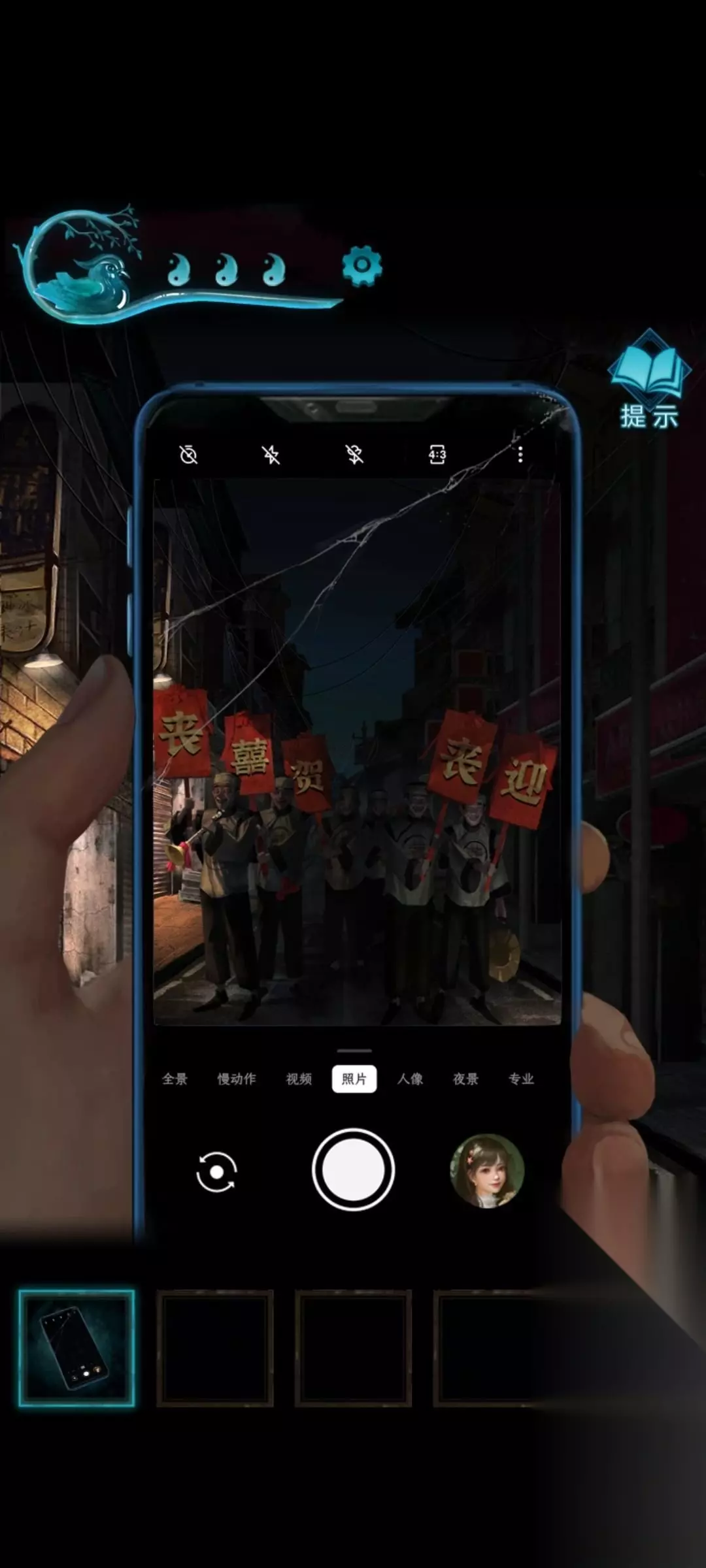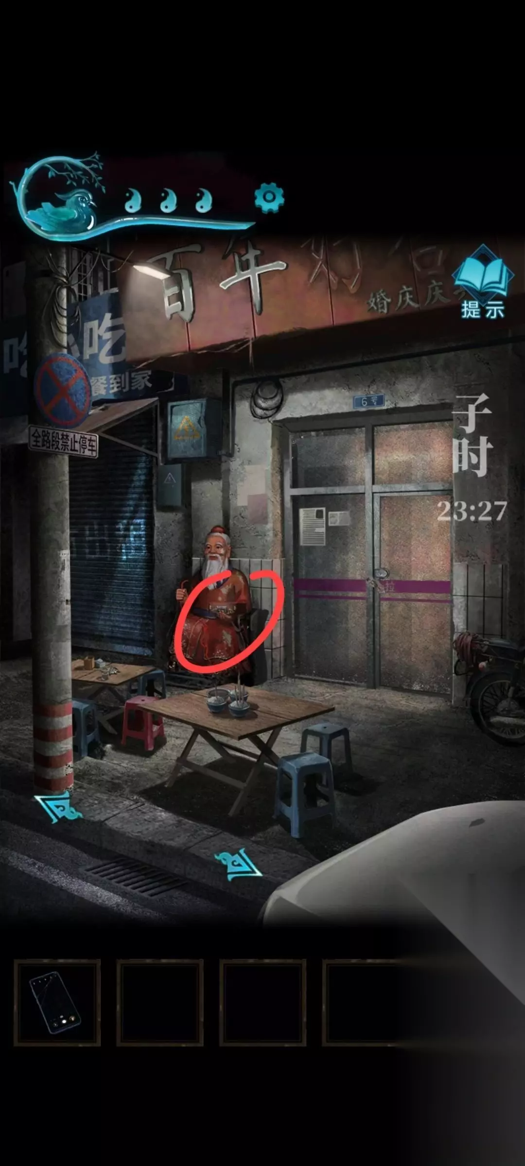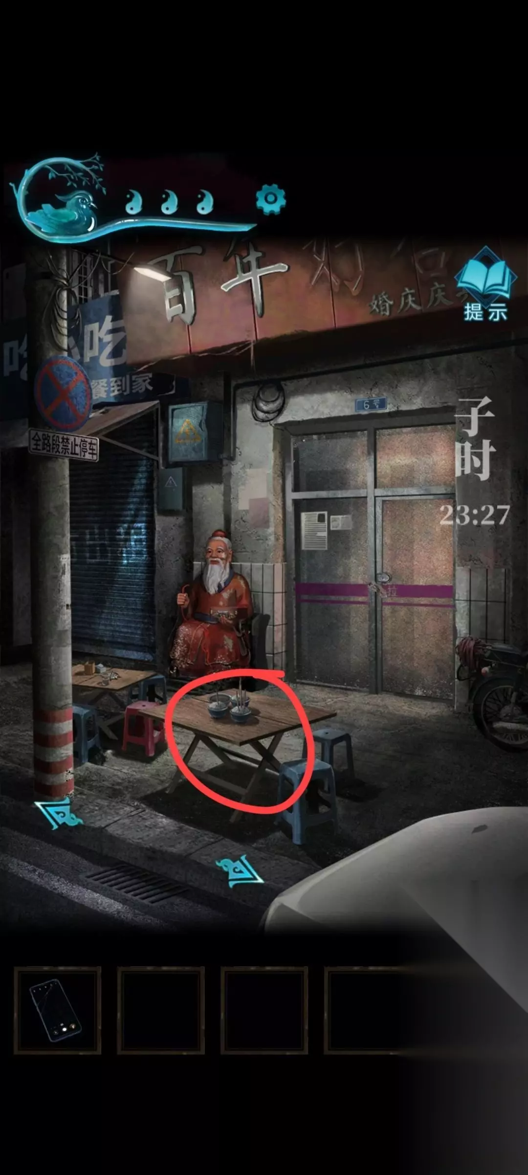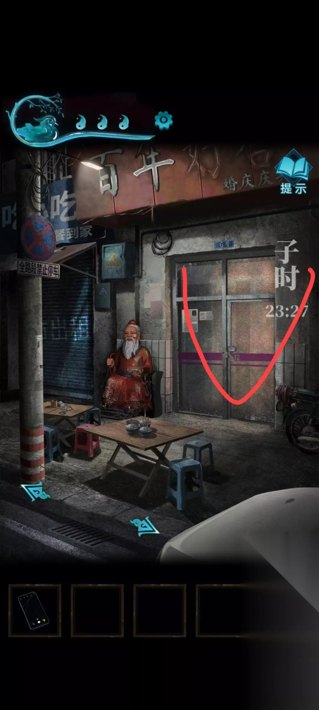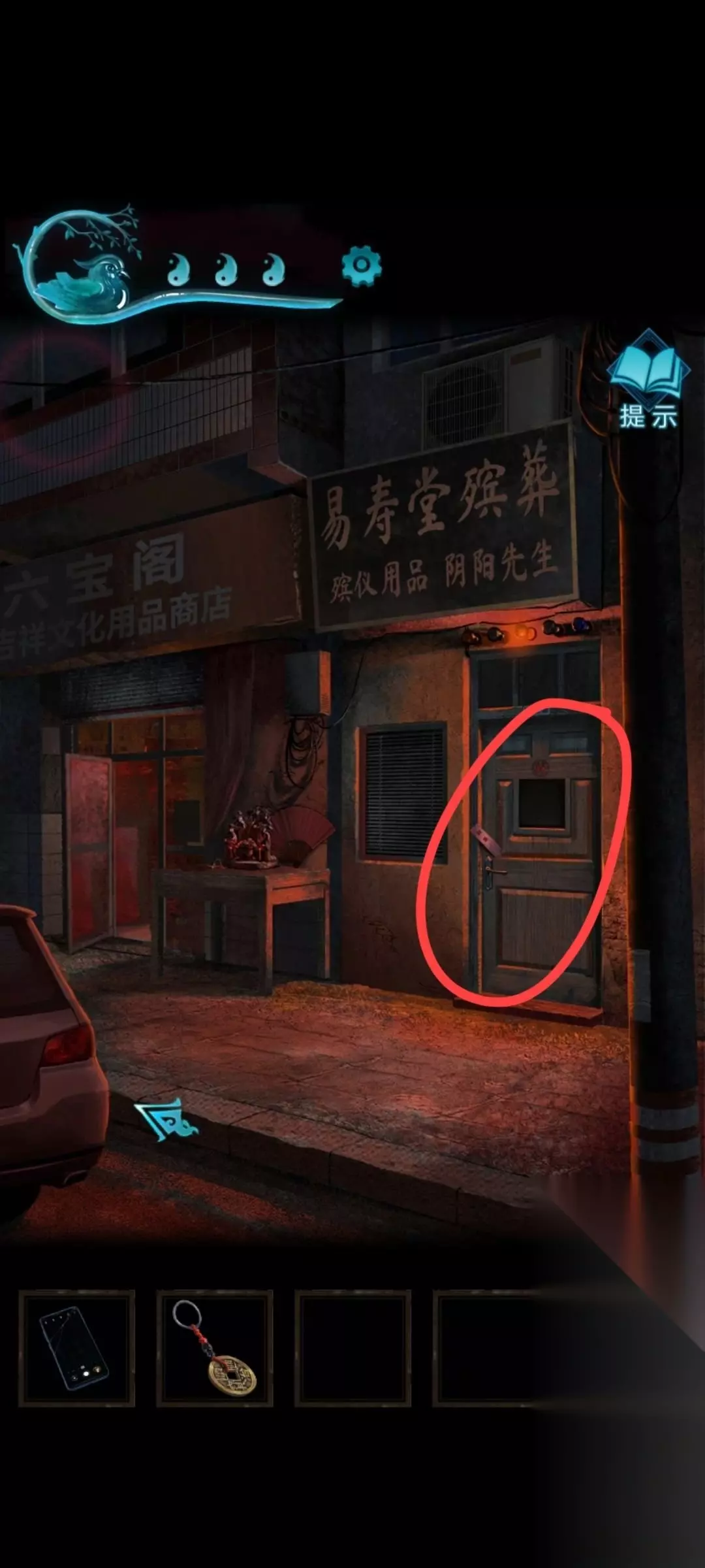 6、密码是丧喜贺丧迎,碗会空得到一个铜钱 7、之后来到右边 点击易寿堂的窗户,看到一组密码