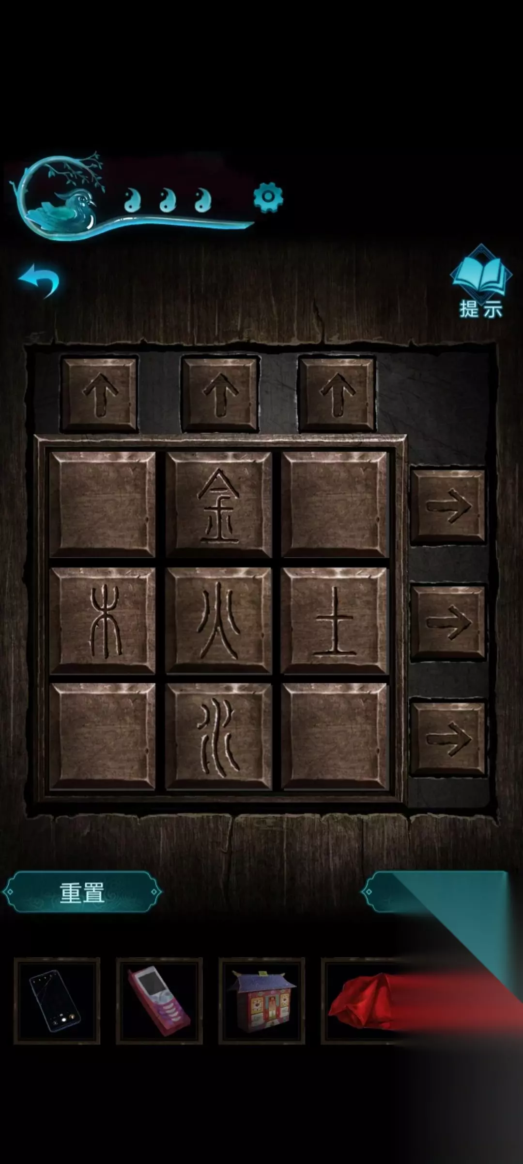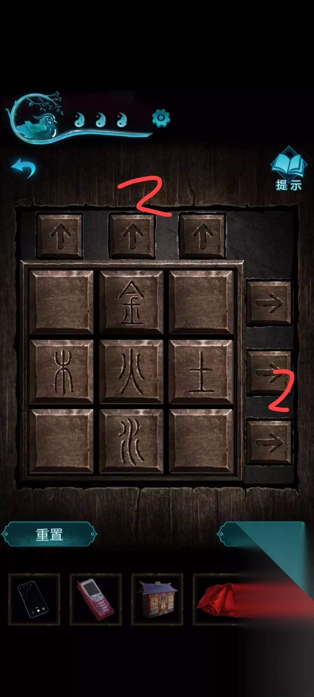 26、点击打火机,再点击烟灰缸 会得到烟灰 之后点烟灰 就会倒进水里 27、之后,点击红盖头再点击水 28、之后回到易寿堂,点击这个窗户,用红盖头擦干净 29、之后会出现棺材 之后点击手机,用手机可以看到一组密码 30、之后回到百年好合,桌子上有两个盒子 31、棺材上就是这两个盒子的密码,用文字打不出来,所以这个只能自己去记了,很简单之后会得到一捆香,还有一本书 屋里会有一个空白符纸 有个指甲刀 32、之后回到财神那里就是易寿堂门口那里,拿回插座,用指甲刀剪开上面的胶带 33、之后回到百年好合 把插座插到电源上 34、把插头插在插座上之后,点击旁边的打印机 把符纸和空白符纸放进去 之后点击ON 35、会得到两个符纸 之后回到六宝阁 36、点击供台,把两个符纸贴上去,把香插上,把房子放到空白盘子上,然后打火机点燃。第二章游戏结束 第三章【离魂】 进房间点书,书要看完有重要的东西。 出来跟着女鬼指的方向走,走到最后打开女鬼指的地方得到驱邪符咒,打开冰箱获得铲子,把冰箱左边房间的贴画铲掉,再把驱邪咒贴上面,符咒上的字不全功效不大。 回房间驱邪书最后一页拿到的纸条还记得吧,根据书架上书的颜色得到4325,拿到眉笔,回来在福州上写字,招福来,驱邪去。 屋子可以进了,进去看到发光的两个地方,点击看书,也要看完。还是之前找到眉笔的那张纸,根据后面看窗外玻璃的颜色,红红紫黄绿白,获得蜡烛。 别走上面和尚送的盒子,把划片划到对应的位置得到小图腾旗,回客厅插在小车上,开动风扇撞倒扫把,就可以进去了。 回房间还是那个纸条,看旁边房间的诡异画,得到紫绿橙绿蓝,得到照片放在厨房。 去外面开电视,开最大音量,看到楼道写着情债难偿,解开桌子上的盒子,得到纸剪刀。回厨房,把剪刀烧给自己。 回次卧把红包剪掉,再拿着那个折纸单子把红包折上,再烧给自己,拿着手电进厕所,拿卫生纸,回到厨房把卫生纸贴到纸人在的橱柜里,还记得房间里的书吗,画符,这个有时限记得快点画。 得到季节盒子,去空调位置,调到空调的最低,解锁第一个,再调到34,解锁第二个,到冰箱开第三个,得到竹杯。 去厨房把之前拿到的蜡烛点燃,会厕所,先把竹杯放好,再拿蜡烛点,拿着接好的水把风铃打湿再剪掉就可以了 第四章【昏晓】 先换成女孩子去下五子棋,之后获得铜像,回到庙前面把铜像塞进去。 再换成男人进去,进去先看书,书是好东西,拿出手机看房梁上的北斗七星闪烁规律,点亮之后根据男人看到的书把字改好,腾空尊天火旨离,然后妹子就能进来了。 妹子进来还是先看书,再拿剪刀把地毯剪了,男人再把地毯下面的东西捡走,女孩子看福字的位置,看小人指的字,得出密码病生老生嫁,男人打开下面的柜子得到瓷勺。 出门,男人把远处石盘上的小王八拿走换成瓷勺,点击远处的地,用那个长的铁条铲土拿到石冠,回后面的庙把石冠放到木板缺口上,把长条的那个也插到神像手上。 妹子下去之后,男人调整福字机关的字,要根据柜子上有的字记住,答案了是死丧生死,男人获得凿子,去最前面的那个庙把脑袋拆下来,把头和小王八一起顺着水扔下去。 女孩子在下面拿拐杖把佛头移到机关上,再去外面把树杈上的皮影剪下来,男的捡走然后进庙,看完牌子妹子下棋,吃就完事了最后剩将帅,拿走半个喜字。 男的拿着皮影点走廊,这里记得跟着皮影走,过完剧情,把手机立石碑上,把烟袋烧给妹子。 男的去前面的庙把钱投了,拿到半个喜字,回到后面的庙,把喜字嵌进去,换成妹子拿烟袋把火点上,男的拿火柴点。 看旁边的书里要神官名讳,答案是木京辛,男的进去拿手机照,到汤婆婆位置的箱子揭开答案,矣替子娘。 然后识别纸人,得到镜子,回到新娘子那里放镜子,把镜子对着她,窗外拿走祈愿牌,交给二爷爷过剧情。 第五章 照例,咱们先看哪边挂着的竹排看故事。 然后爬山去山上捡树枝, 下来去后面的庙看文字,拿到陶俑身上的断剑,根据顺序敲甲乙丙丁架子,然后看文字记好演奏顺序。 演奏完会有仕女出来,拿走酒杯,不能酒祭。回到车旁看剧情,上山把酒倒给树。开箱子记住上面的符字,坤宙乾神凡鬼。 这个是仕女脸上的图案 进屋子解桌子上的九宫格,得到火柴。这里我跳广告了。不好意思。 门板很好拆先拆最右边的那根后面就好看着拆了,门打不开没关系,开个缝看看蜡烛位置。 到车的位置,按照顺序点香,比较难点,点完获得字迹,可以解开山洞前面石狮子脚底下的机关,获得一把钥匙。 按照上面的图案搞 打开山洞里刚才的房间,进去先翻柜子,得到一只珍珠耳环,知道了莫琪的事。再用老婆的手链把胶带扯开,打开得到神像和蜡烛。 把蜡烛扔灶台底下,再点把火,显现出字迹。 回到树洞第一个屋,根据铜钱推出答案(我手慢了没截上)我画一个。 得到刺绣,把之前从陶俑哪里得到的箭插在上面交给外面的仕女。 拿到镜子返回车旁边,把镜子放上,再把蜡烛放上点上火,记住镜子上闪烁的八卦字符,石门打不开去山上,按顺序打开丧石块,获得箱子和金贴画。 回石门拿箱子卡主石门,把贴画贴在最里面的红贴纸旁边,把珍珠耳环扎在右上角的洞上,拿到阴阳玉。 回前面把阴阳玉钳在上面,黑白相反打开石壁,记住图案,打开里面的柜子,找到龟壳。 回车旁边把龟壳扔进去,烧裂后拿钳子把龟壳拿来,看图案,回山洞,转动机关,得到托架。 把托架放到祭坛上把簪子放上。看好镜