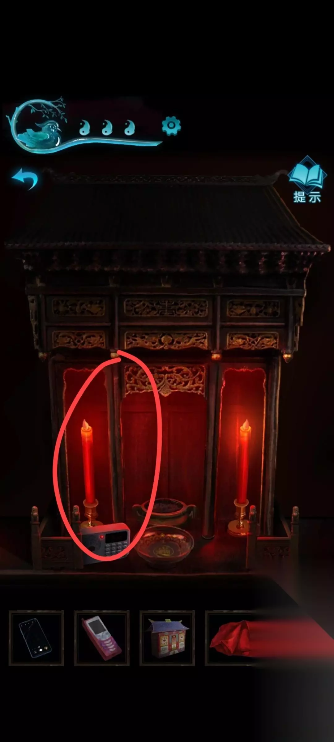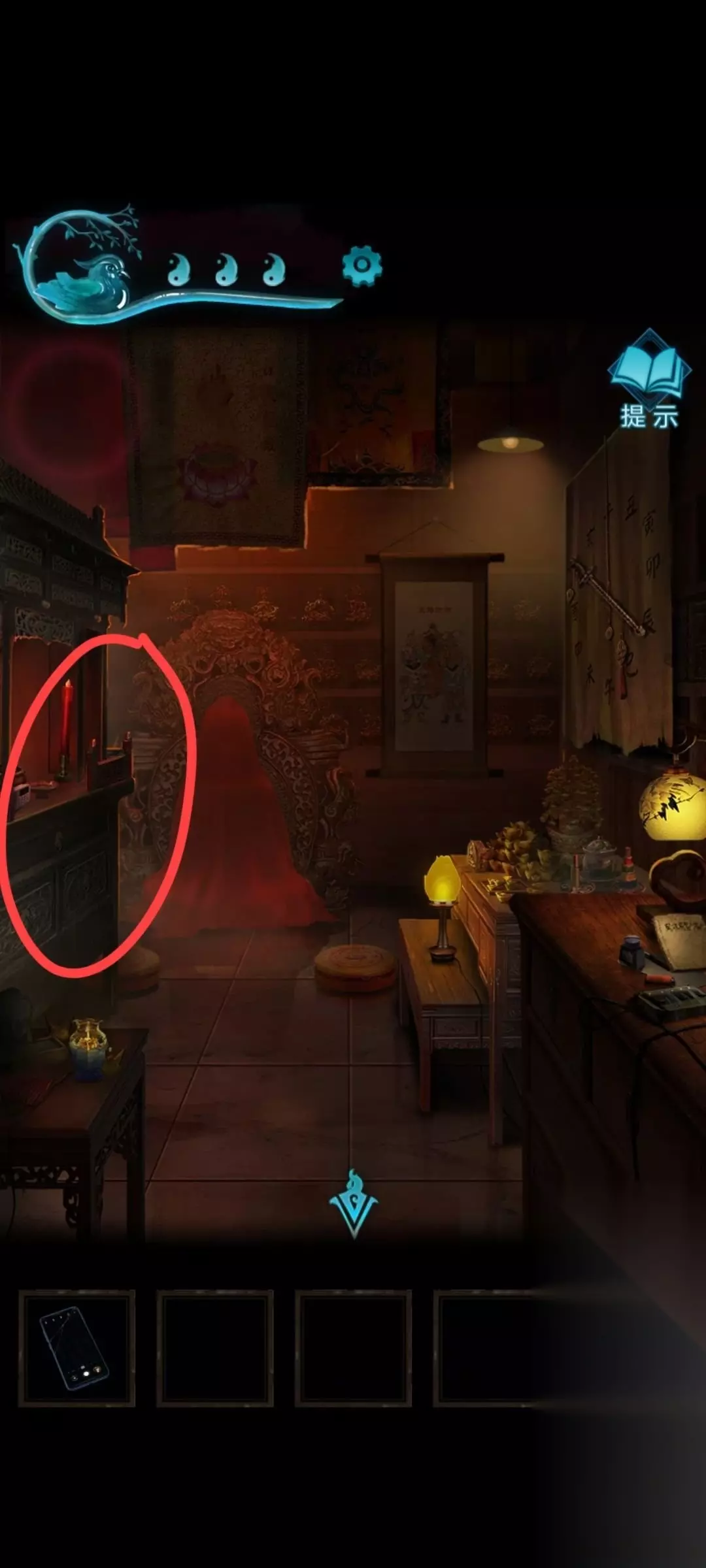 13、之后旁边的画像会打开,得到道具,再点旁边的供台 会得到符纸