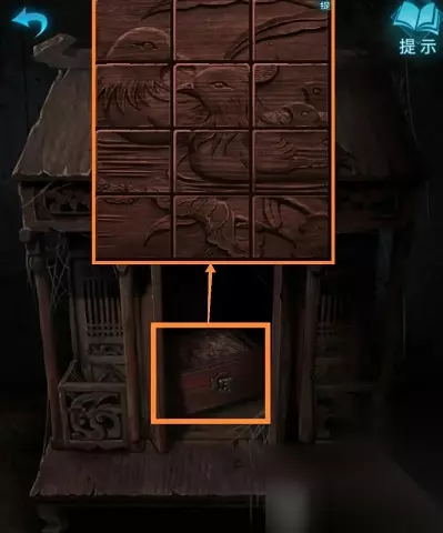 15、箱子打开后,点击箱子中的钥匙,获得一把钥匙。 16、回到初始房间,点击右侧小柜子。 17、使用刚才获得的钥匙打开柜门。 18、柜门打开后,可从柜子中获得一把钳子。 19、来到院子中,点击院子大门,使用钳子拧开大门上的铁丝。 20、点击田地中的稻草人。(高能预警) 21、点击稻草人,从稻草人身上获得红色长飘带。 22、点击田地下方的镰刀台,将飘带放到镰刀上,可获得三段飘带。 23、使用三段飘带,点击右上角的稻草,可获得一捆稻草。 24、将一捆稻草放置在稻草人右胳膊上,随后左侧胳膊的火钳会掉落下来,即可获得火钳。 25、回到院子中,点击仓库。 26、在仓库中,使用火钳拉动灯绳,仓库灯就打开了。 27、点击仓库右侧的柜子,从柜子上放置的白色笔筒中获得一支铅笔。 28、点击仓库中间的小神龛。 29、点击小神龛中间放置的箱子,可以看到一个凌乱的拼图面板,该拼图不需要移动方块,只需点击方块将其翻转至正确的图案即可,最终如下图。