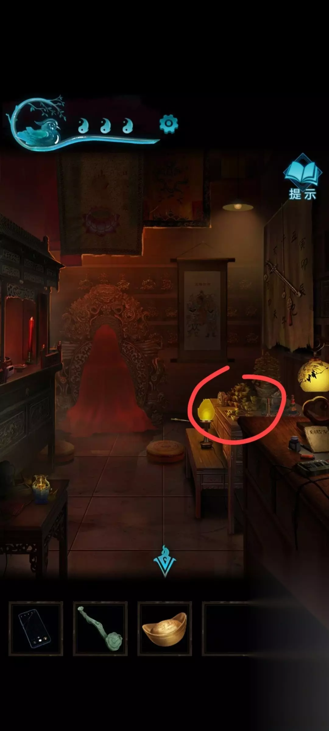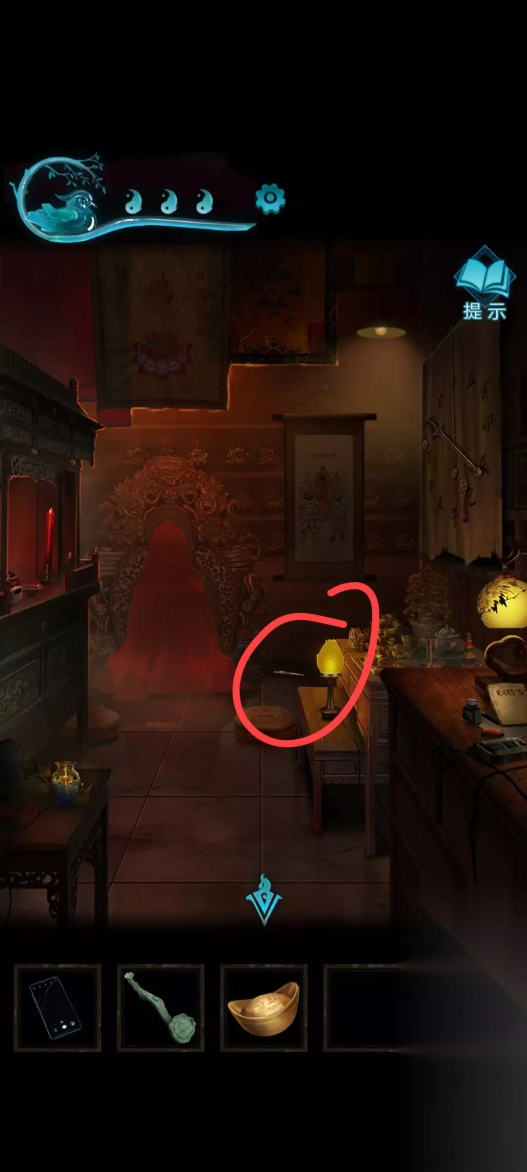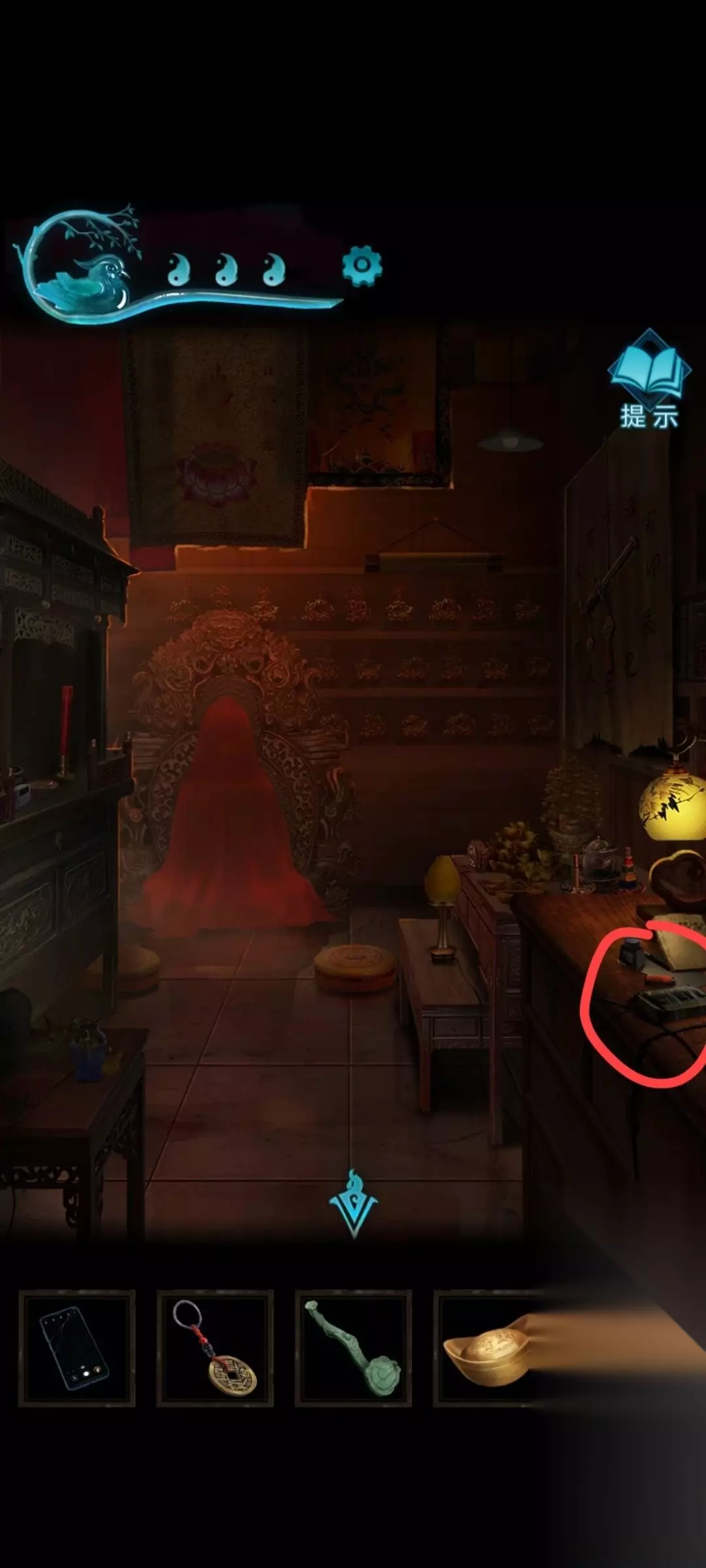 9、之后来到易寿堂旁边的屋里,六宝阁, 进去后关掉桌子上的电源,之后电源旁边有打火机,记得看那个电源旁边的书