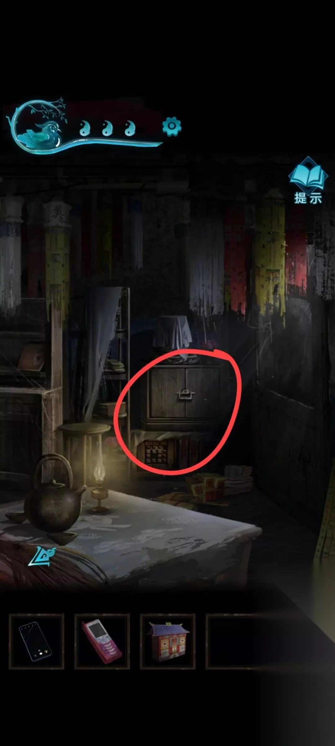 30、箱子打开后,从箱子中获得一个铜指甲。 31、回到初始房间中,点击左侧柜子,点开下方柜门可以看到一个洋娃娃。 32、使用铜指甲将洋娃娃上的钉子拧开,获得两节电池。 33、回到仓库中,点击仓库左侧桌子上的磁带。 34、使用铅笔将磁带重新拧好,获得一盘完好的磁带。 35、将磁带和电池分别放入播放机中,注意放磁带时要先按下按钮将磁带盖子打开。 36、磁带和电池放好后,点击播放键,随即听到二爷爷的一段话,“虔请魕娘子送子来”。 37、点击仓库右侧柜子,可以看到柜门上有两列按键。 38、依次按照“虔请魕娘子送子来”的顺序按下按键即可打开柜门,从柜子中可以获得一把钥匙。 39、随后完成一段剧情即可结束。 第二章【迷途】 1、点门出不去 2、点桌子抽屉,之后闹鬼 日历被吹走 点击日历位置 之后拿到钥匙,用钥匙再打开抽屉