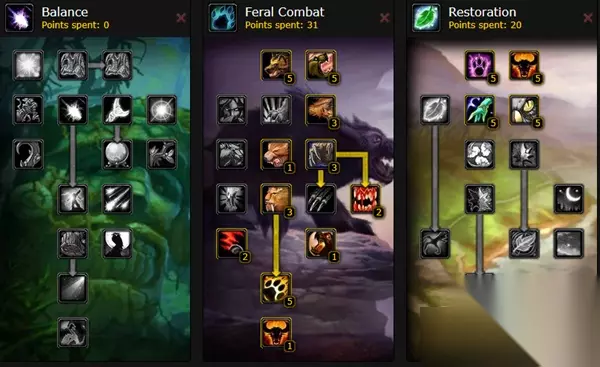 魔兽世界乌龟服德鲁伊练级天赋输出手法攻略汇总: 魔兽世界乌龟服德鲁伊练级攻略: 德鲁伊练级以野德天赋为主,兼顾坦克和输出的职责 1、野性天赋加点选择 5/5 凶猛(减少 5 点怒气的槌击、挥击、爪击的成本) 5/5 野性本能(在熊形态下增加威胁15%) 5/5 厚皮(增加护甲20%) 1/1 野性冲锋(中断施法 4 秒的冲锋) 3/3 锋利利爪(熊或猫形态暴击增加 6%) 3/3 掠食性打击(熊或猫形态近战 AP 增加 150%) 2/2 原始狂怒(暴击时 100% 几率获得 5 怒气)熊形态) 2/2 野蛮之怒(爪、耙、槌和挥击伤害提高 20%) 1/1 精灵之火(远程攻击,护甲值降低 175,高威胁) 5/5 野性之心(智力增加 20%,熊形态增加耐力 20%,猫形态增加力量 20%) 2、恢复天赋加点选择 5/5 愤怒(100% 几率)熊形态 10 怒气,猫形态 40 能量) 5/5 改善治疗之触(减少施法时间 0.5 秒) 3/3 反射(15% 法力回复) 5/5 敏锐(减少 20% 威胁)