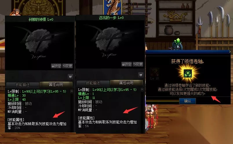 第二个方面改动:新增三个被动技能。其实,这三个被动技能,跟三觉有关系,每个职业都会涵盖。“刹那的领悟”,这个被动技能,能增加基本攻击力和转职系列技能攻击力。可以堆叠等级,1级就是1.5%技能攻击力,比如学习4级后,可增加26%的技能攻击力。可以说,“刹那的领悟”被动,对红眼来说,提升非常之大。
