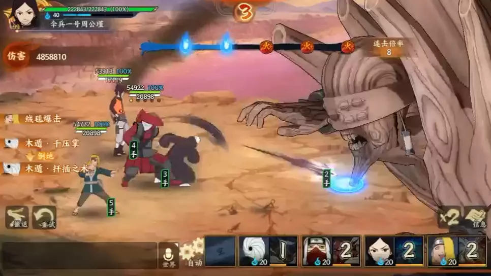 第一回合:对方奥义完毕后火主奥义,对面飞段被普攻几下就挂了。 第二回合:鸣人和老紫奥义长门。 第三回合:我爱罗奥义。 第四回合:普攻。 第五回合:老紫奥义迪达拉。 第六回合:老紫有奥义的话就奥义,没有的话就普攻,但不要挂自动,不然我爱罗会自动取消结界。 风主通关攻略 阵容搭配:志村团藏(行动1)、四代火影(行动2)、山中风(行动3)、风主(行动4) 天赋选择: