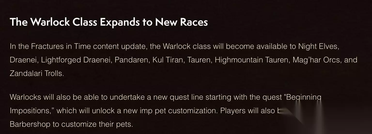 术士也成为继法师、盗贼、战士、武僧和牧师之后,第六个面向全种族开放的职业。然后,萨满、圣骑和德鲁伊这些还会远吗?