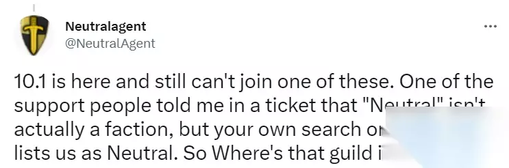 暴雪很快给与了答复,原因是跨阵营公会有一个隐藏前提,就是不支持中立阵营,或者说中立阵营不算一个“阵营”,你的角色必须先加入联盟或部落。而Neutralagent一直龟在新手村,仍是中立状态。