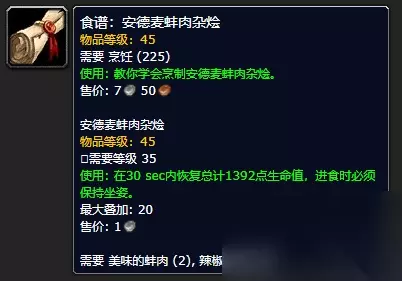九、 炖旅行鸟 这是一种部落玩家才能直接获取的配方,如果你在贫瘠之地练级的话,非常建议学习这个配方,你在练级时获得的陆行鸟肉又多了一种用处。