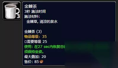 六、 金棘茶 法师可以通过技能制造食物和水,但是其它法术职业,例如术士或牧师等,大多数都会选择使用金棘茶恢复法力值。