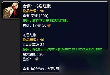 八、 龙息红椒 你希望能获得像术士或法师那样的火焰输出吗?那你可得试试这个食物了。食谱可在凄凉之地(40,79)的超级商人680型处购买。试试在输出时突然就释放龙息术是种什么感觉吧。
