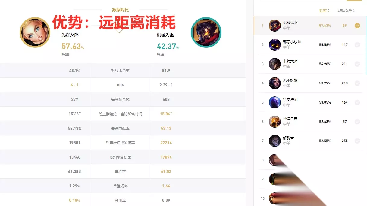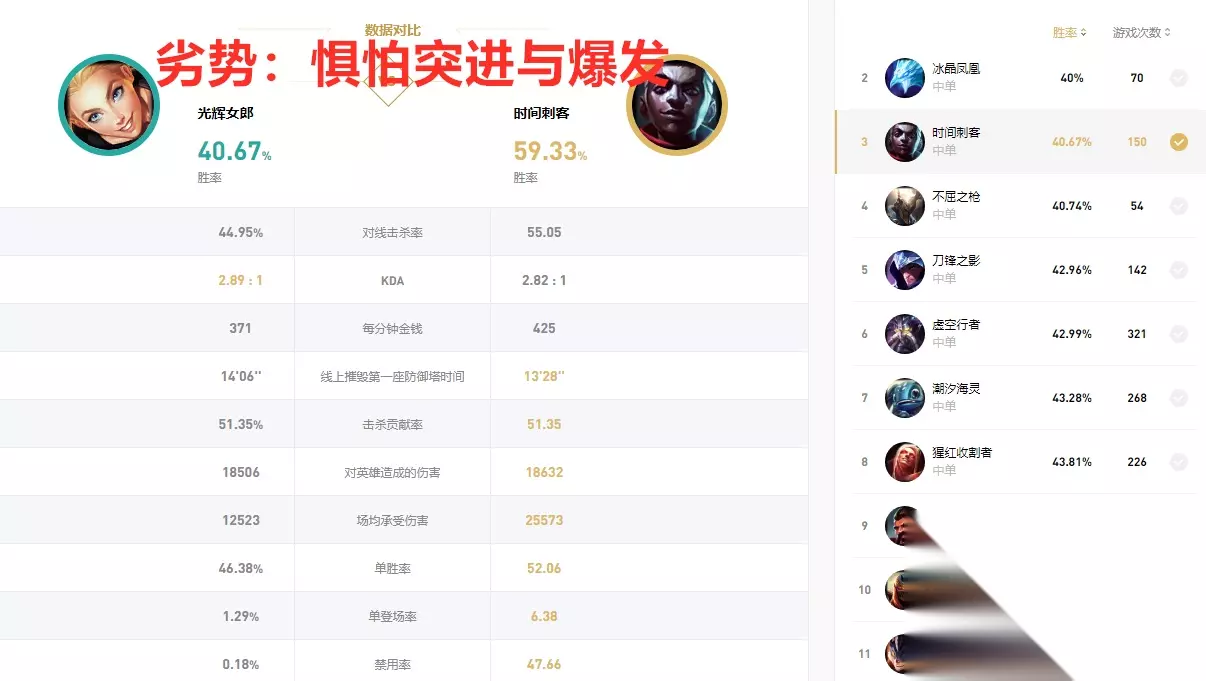 具体表现在和不同英雄的对线胜率上,当面对爆发不高或者射程比较短的英雄时,拉克丝就能凭借自己技能超远距离的消耗取得优势,比如维克托,卡牌等。而当面对像小鱼人、男刀和艾克等灵活的高爆发英雄时,拉克丝不仅是在总体胜率,还是在对线的击杀率上,都会全面处于劣势。 技能加点