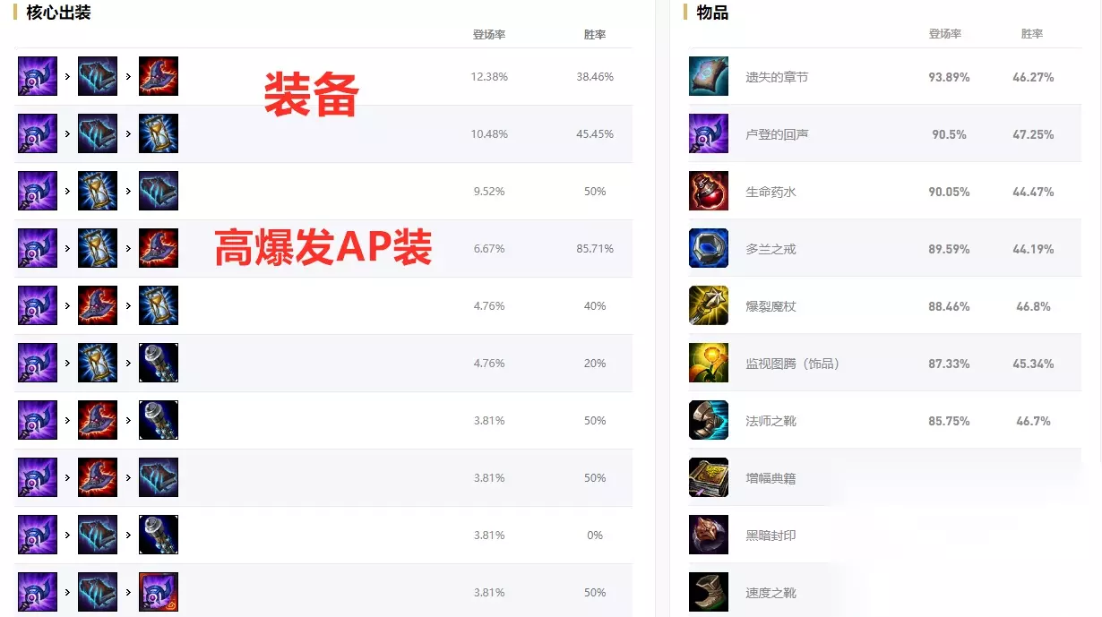 中单拉克丝装备也以高爆发的AP装为主。和其他法师英雄一样,出门装选择多兰戒和药水,多兰戒提供的法术强度和法力值回复可以让拉克丝更好地度过前期,60点生命值也可以增加线上的生存能力。第一个大件选择卢登的回声,可以极大的增加伤害和poke能力,提供的10%的冷却缩减也可以让技能更快的冷却完毕。