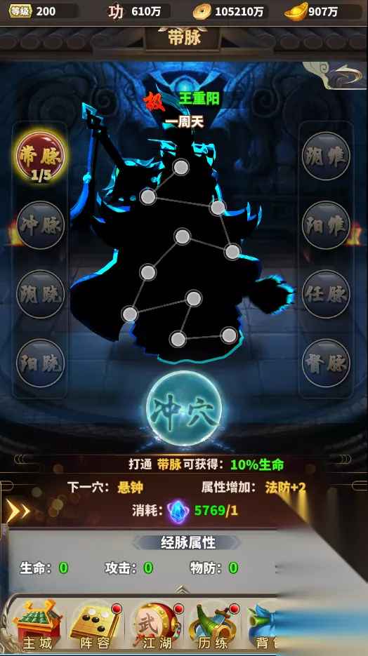 奇经八脉 材料来源:通过历练中黑木崖玩法获得真气,通过消耗真气进行冲穴 冲穴要求:拥有8种脉,每种脉5级,升级后可修炼下个脉。