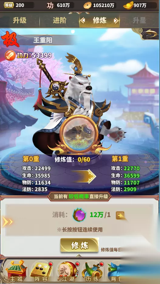 修炼 材料来源:通过精英副本玩法获得修炼丹,点击消耗进行修炼。 修炼要求: 每重修炼级别都有一定的机率直接升级,这就看玩家的运气了。 每天24点清零,在本天内尽快消耗。