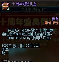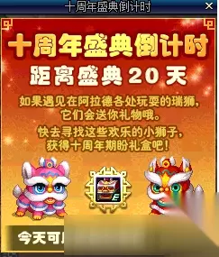 【dnf十周年活动大全】 dnf十周年倒计时活动 活动时间:6月7日-6月18日 活动介绍 活动期间,每天都会有2只瑞师随机分布在阿拉德各处,找到点击即可获取奖励礼盒,每天可获得2次礼盒,是不是非常简单呢?获取次数是账号限制的哦,获得的礼盒为账号绑定。