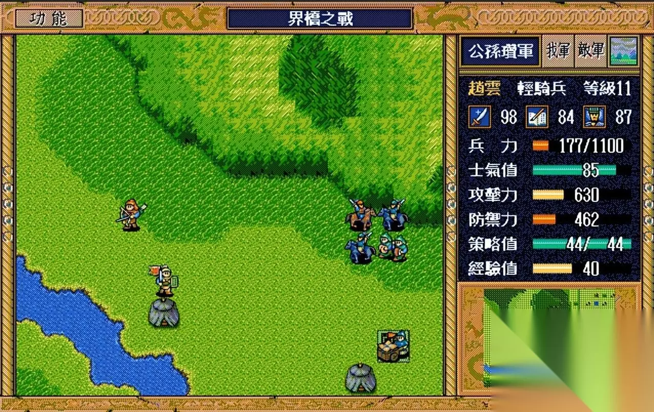首先我们来看一下当时大神拉克西丝单通时的规则: 1、刘备只允许移动,禁止其他操作(包括劝降)。原则上不禁止50点经验,但越少越好。2、除刘备和简雍以外,其余人禁止出场。如有固定出场,禁止一切操作。3、简雍无法出场的关卡,其余人随便打,只要刘备不得经验即可。4、使用GB4,不用补丁。 看了这4条规则小编已经甘拜下风了,禁止50点经验倒还好说,可禁止刘备劝降,那也就意味着打吕布那关必须熬到30回合后才能进城,这样简雍就没剩下几个回合可以进攻了,这不是让本来攻击力就低下的简雍雪上加霜嘛。 使用GB4倒是可以理解,又不是什么增加每回合反击的外挂,只是可以随时存档读档而已,不然一个回合失误就得撤退重来,任谁也没有耐心用简雍这种小人物通关吧。