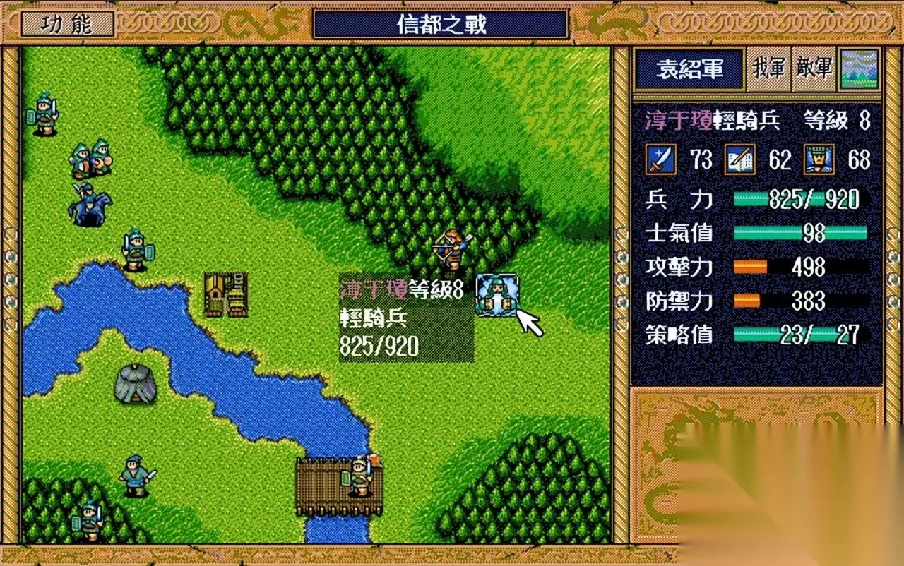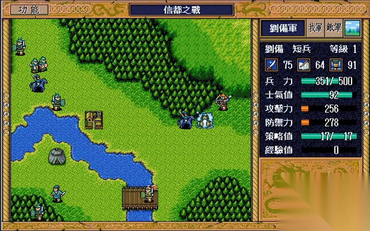信都之战单通的过关思路: 简雍躲进树林灭掉上路两个主动进攻的敌兵,下路的话让刘备去桥头堵住,这里有个小BUG,就是当下路敌兵贴近刘备时不但不攻击,反而掉头往回走,我们可以利用这个BUG,单数回合让刘备往桥左边走,双数回合刘备往桥右边走,这样敌军会跟着刘备左右摆动,轻松堵住下路的进攻。 第十四回合淳于琼进攻前务必让简雍灭掉上路的骑兵和贼兵,然后再用浓雾书混乱淳于琼,不过这个混乱有点看脸吃饭,运气差的话淳于琼一回合就能醒过来,如果刘备刚好在桥右边那就惨了,因此GB4存档是很重要的。 本关不贪图全员50点经验,击退淳于琼就好。 过关后简雍等级为5.37级,消耗1个豆子1瓶酒2个浓雾书,收入的话是200金。