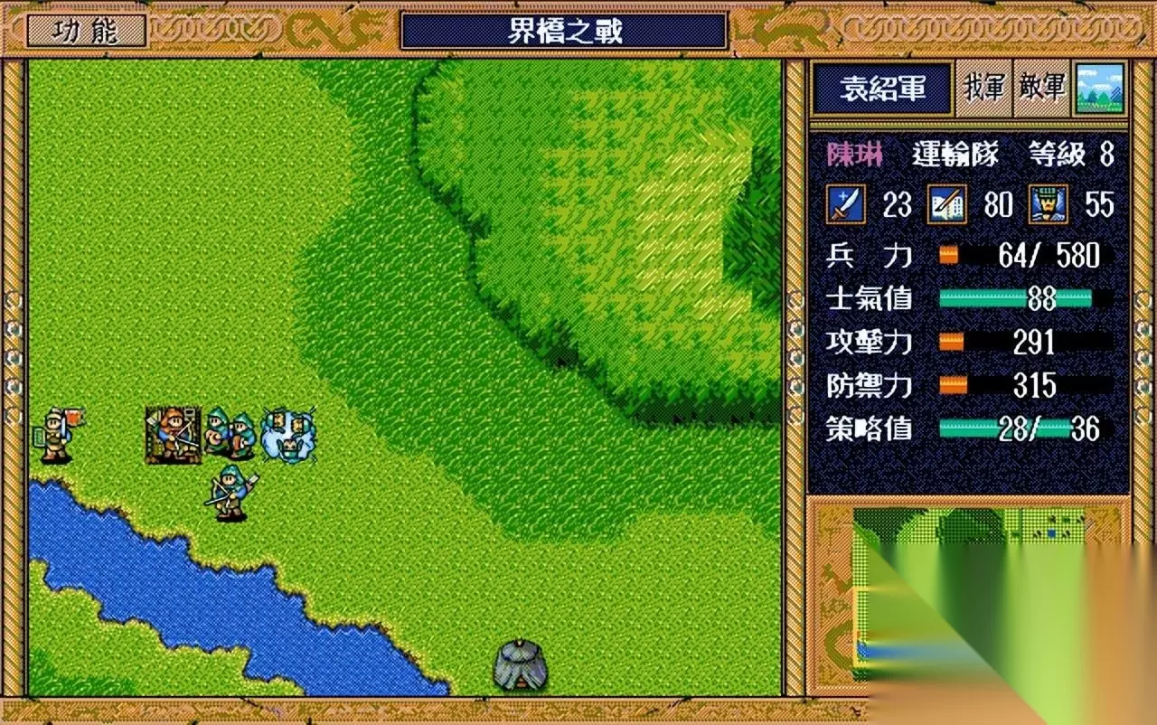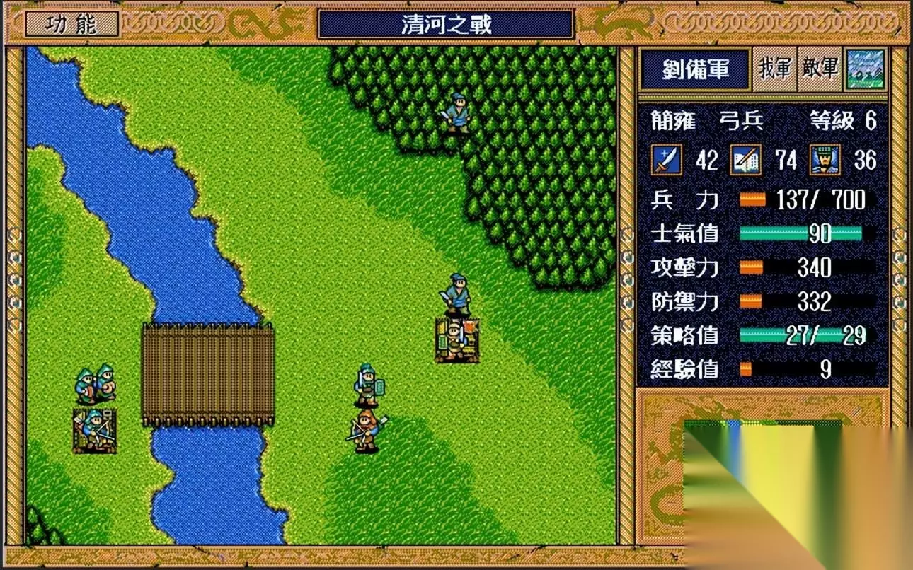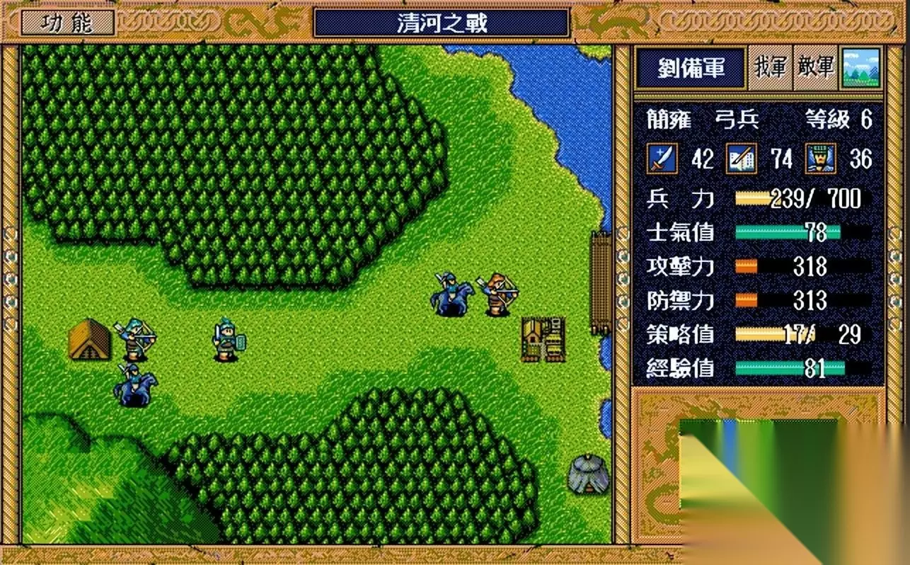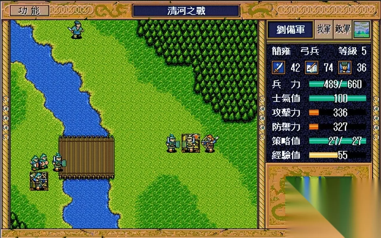 界桥之战过关思路: 充分利用友军的攻击力,前期猥琐在后方不要动,待到敌军名将残血时上去收割人头,逢纪、高览、沮授等人都是满满的经验值,千万不要错过。 友军全员撤退后,要退守到村庄慢慢消灭陈琳、焦储、军乐队和骑兵等4支部队,本关回合数有45回合,完全够用。 不要正面硬刚张合、袁绍等人,简雍攻击力太弱,刘备1级并且啥也干不了,打完运粮队后就沿着山路偷袭粮仓去,别贪图那些经验值,不然刘备被击退就不划算了。