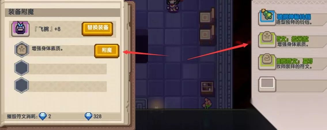 6、在他这里,可以把任意符文附魔到装备上面,比如这里附魔的是拉米拉,它可以为装备附魔上增加身体素质的词条。
