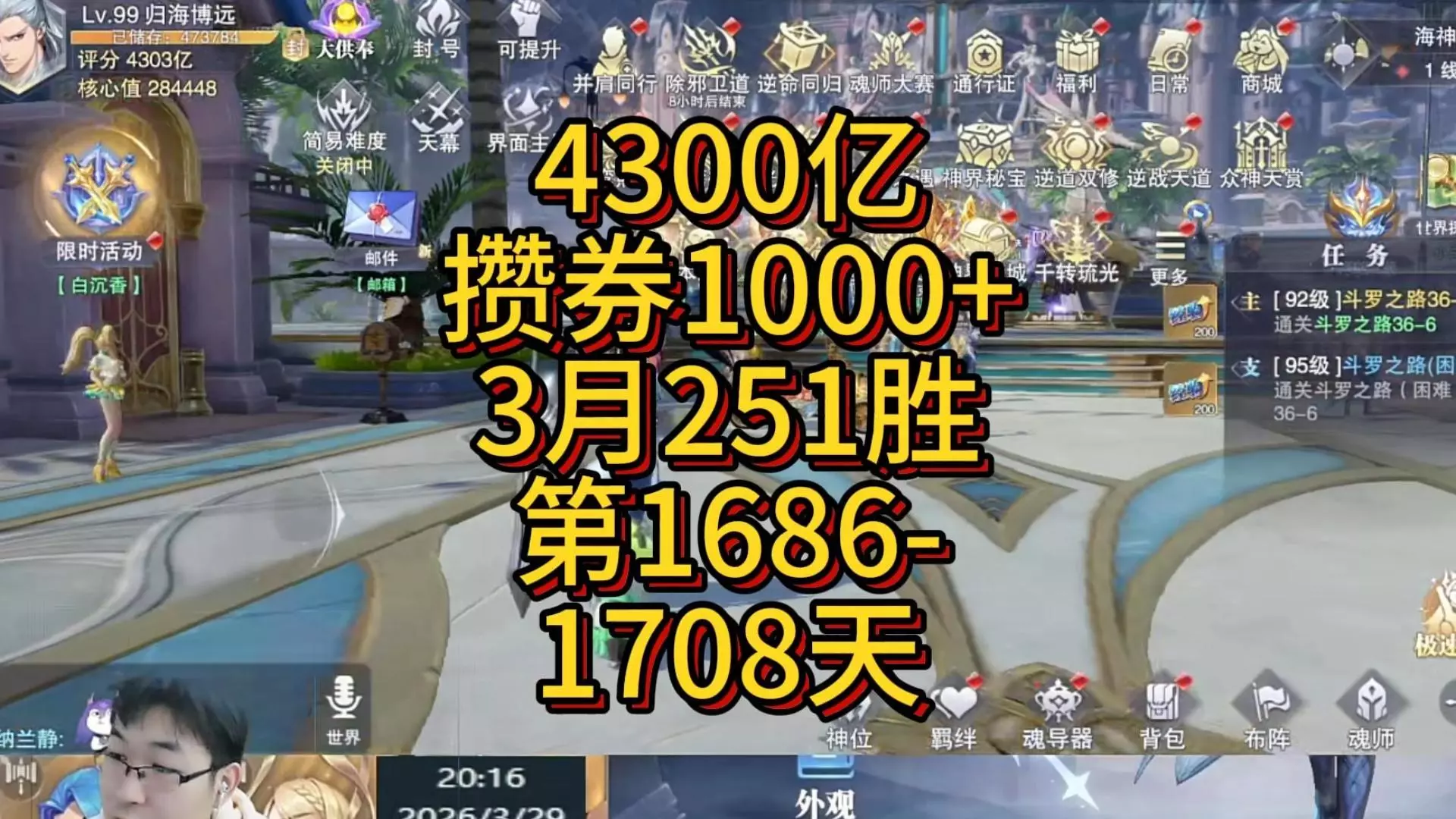 这是斗罗大陆魂师对决的游戏内容,玩家用600多张券抽卡王林,成功将其满星,肝完竞技场后还剩500多张武魂觉醒券,同时展示了背包道具、魂师阵容、神级魂兽等游戏内容,战力提升200亿。