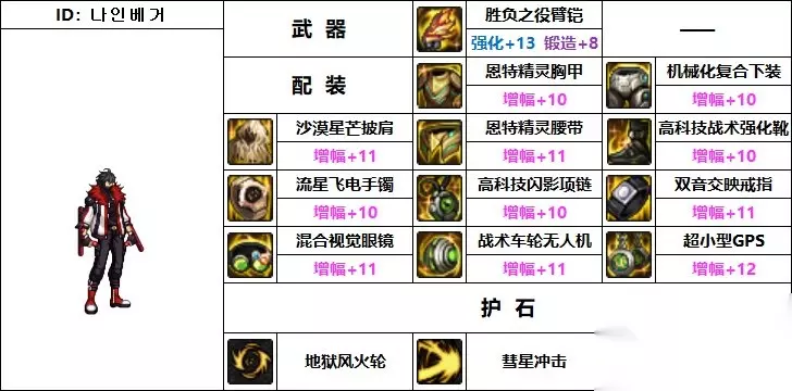 武器:胜负之役臂铠 上衣:恩特精灵胸甲 护肩:沙漠星芒披肩 下装:机械化复合下装 腰带:恩特精灵腰带 鞋子:高科技战术强化靴 手镯:流星飞电手镯 戒指:双音交映戒指 项链:高科技闪影项链 辅助装备:混合视觉眼镜 魔法石:战术车轮无人机 耳环:超小型GPS 2、韩服第二男柔道家