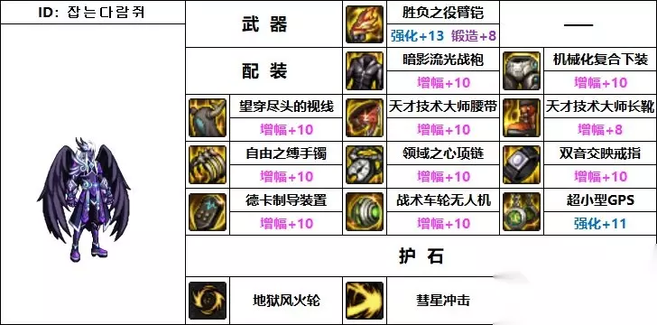 武器:胜负之役臂铠 上衣:暗影流光战袍 护肩:望穿尽头的视线 下装:机械化复合下装 腰带:天才技术大师腰带 鞋子:天才技术大师长靴 手镯:自由之缚手镯 戒指:双音交映戒指 项链:领域之心项链 辅助装备:德卡制导装置 魔法石:战术车轮无人机 耳环:超小型GPS 3、韩服第三男柔道家