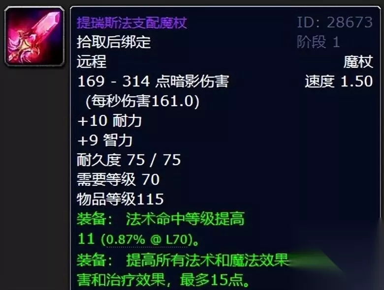 TBC初期而言,治疗魔杖真的是稀缺货了。而这款歌剧院巫婆的蓝钻魔杖必然是治疗牧师最垂涎欲滴的存在。要精神有精神,要智力有智力,29点的法术治疗也是绝绝子了,不过好是真的挺好的,但是掉率几乎为零。你像怀旧服喵叔的牧师小可爱踏破卡拉赞的门栏了也不曾遇见过! 五:提瑞斯法支配魔杖