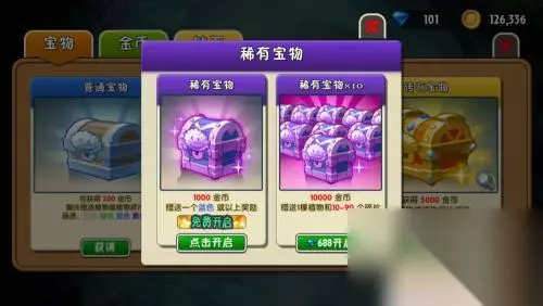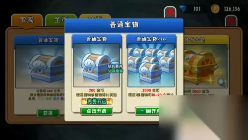 3.另外分享一个每天可以获取植物碎片的方法,也有几率获得一棵新植物。普通宝物每隔24个小时刷新一次,稀有宝物每隔72个小时刷新一次。传奇宝物必须使用钻石开启了(这个就不用考虑了)。在游戏主页面点击“宝物”,进入开启宝物页面,点击即可开启。如图所示