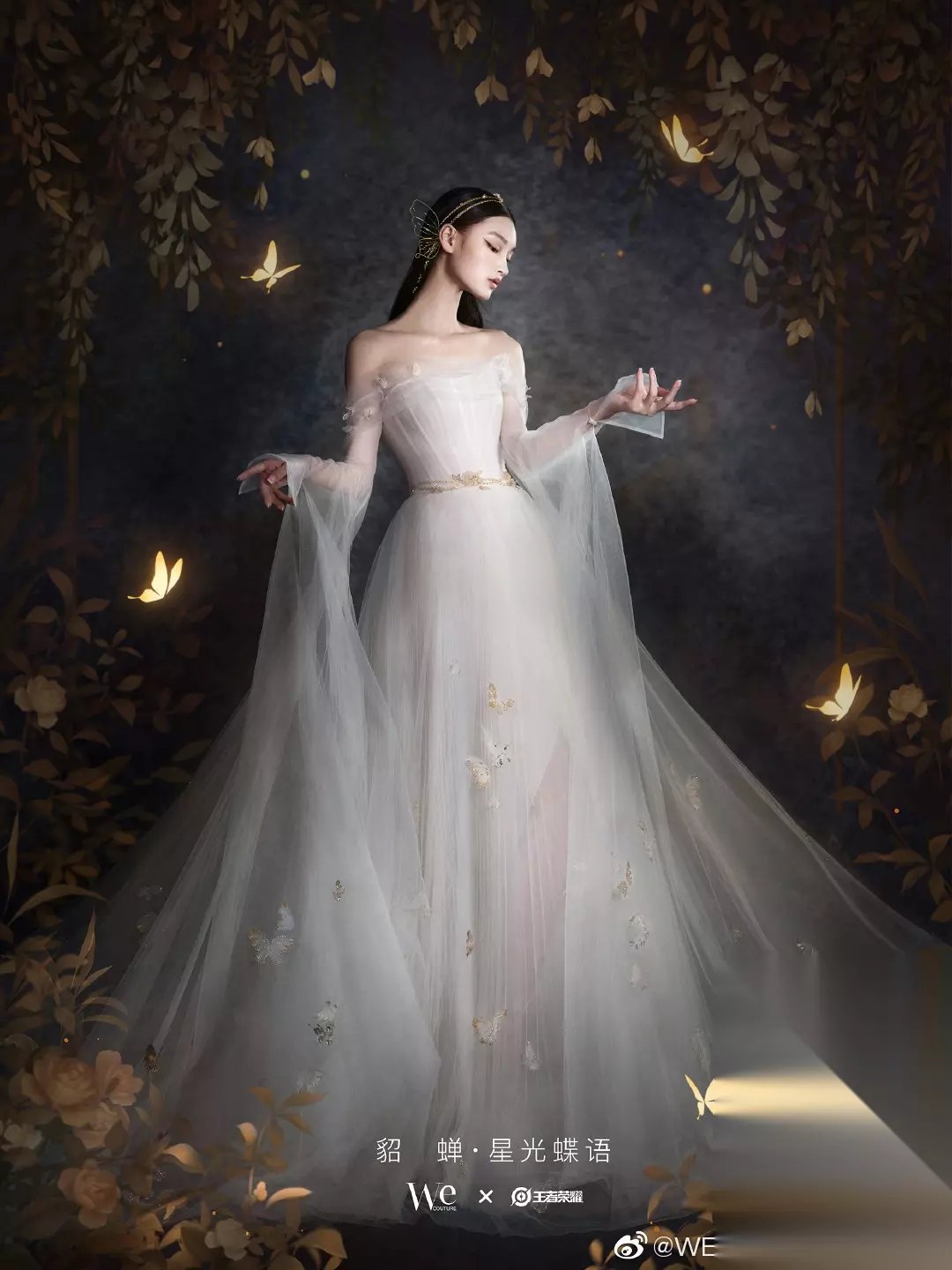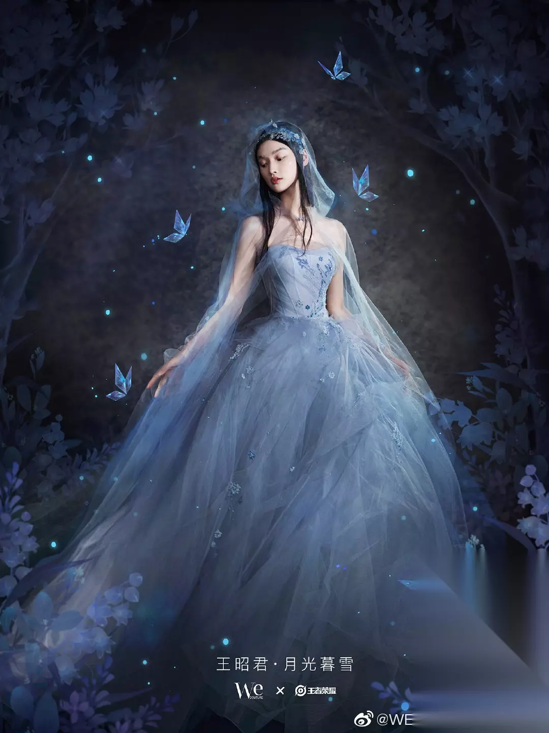 王者荣耀系列婚纱介绍 本次联名合作系列,我们从英雄人物的个性气质及代表元素出发,于古诗词中汲取柔蓝、夕岚、缟羽与目童子色,为婚纱着色。利用没骨画技法,将其如水墨般渐变晕染;结合水袖、辑珠等传统形制工艺,赋予婚纱典雅的东方气韵;借由手工造花等高定技法,勾勒细腻灵动的角色氛围;法式钩针结合独特的手工钉珠,艺术化呈现当代女性特有的魅力,将浪漫情愫流淌于每一处细节。 【瑶】