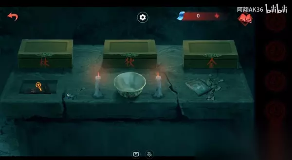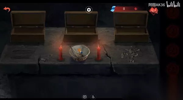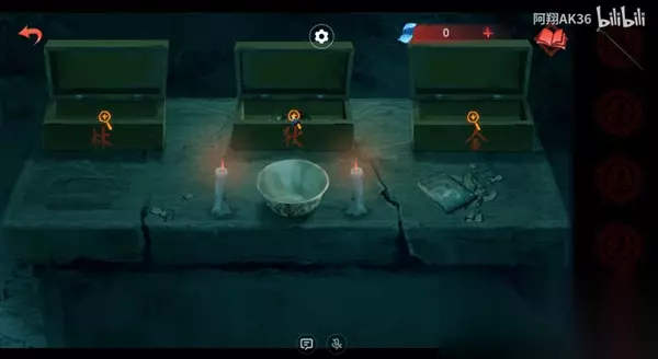 7、回到第三个场景,有蜡烛的石桌,这里有三个盒子,把蛇放在中间的盒子里,再等男主那边将剩下两个摆齐;