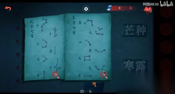 12、然后将获取的镜子放在上面的位置,会照出光,等女主将石床打开,根据男女主两本书的线索来调整光照的角度(就是镜子上的日期对应的图案是哪个节气的字,就点亮哪个);