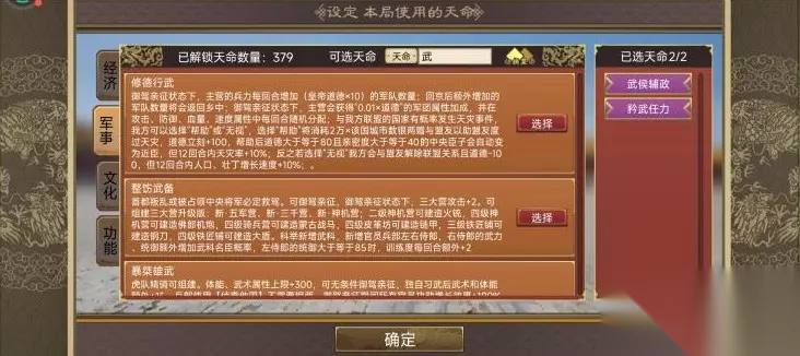 6.第二年前,注意元阳丹及多子多福煎数量。生孩子前提前存档SL。基本上SL一两次就能完成夺门之变的皇子数量大于等于5任务。杨玉环任务使用策卡魏晋风流或者梨花苑加快乐。至此第一年任务全部完成。 7.第二年四月紫宸殿使用命数更迭,更换天命武侯辅政/生子当如孙仲谋、矜武任力,并派出多个兵团,进攻国力低于我国的国家(完成贾似道攻占城市任务)。后续使用寻画有方,选择五个武力值大于80的随从(完成皇父典故最后一个任务)。