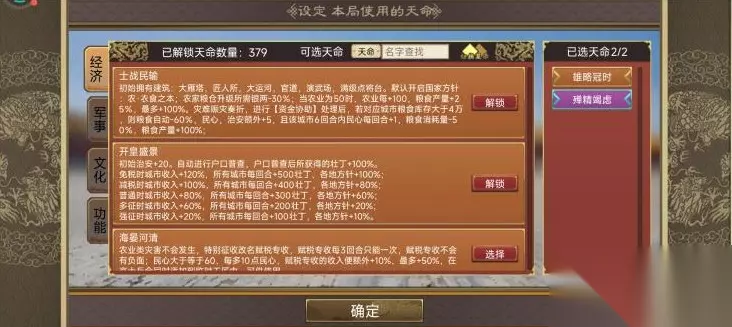 3.地图选城池多的地图,我用的初始地图有点经济压力。 二,具体操作 1.开局携带天命钧瓷柴窑及天命朝夕不倦进入游戏。(因皇父摄政王典故影响,必须带朝夕不倦才能上朝。钧瓷柴窑制造近臣及缓解经济压力)