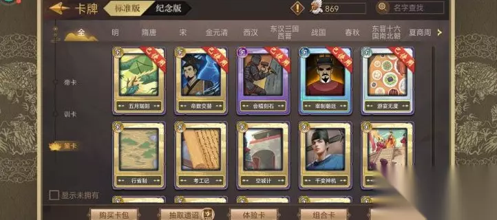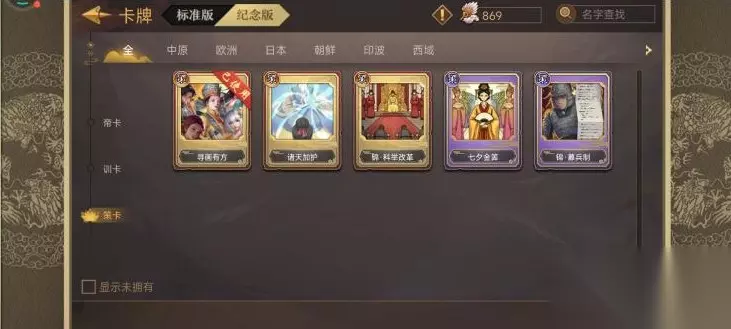 一,前言 1、开局初始天命格减七,因此我们初始只能带两个天命。需要天命如下:SP柴荣的天命钧瓷柴窑、朝夕不倦;宇文泰的天命雄略冠时,典故天命殚精竭虑;刘禅的天命武侯辅政或者SP孙权的生子当如孙仲谋,SP秦始皇的矜武任力(其他快速出兵打仗的天命也行)。 2、需要策卡:命数交替、宰制朝庭、会稽刻石、寻画有方,其他策卡随意,最后是开两个经济及军事策卡。我一共用了六张策卡如图。