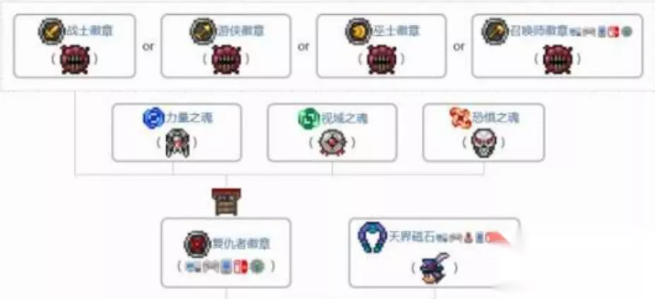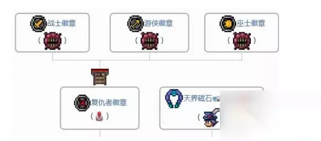 《泰拉瑞亚》天界徽章获取方法 使用1个天界磁铁和1个复仇者徽章通过工匠作坊即可合成。 1、我们首先要准备视觉灵魂、恐惧灵魂、力量灵魂和职业徽章这4件道具将它们合成为复仇者徽章。