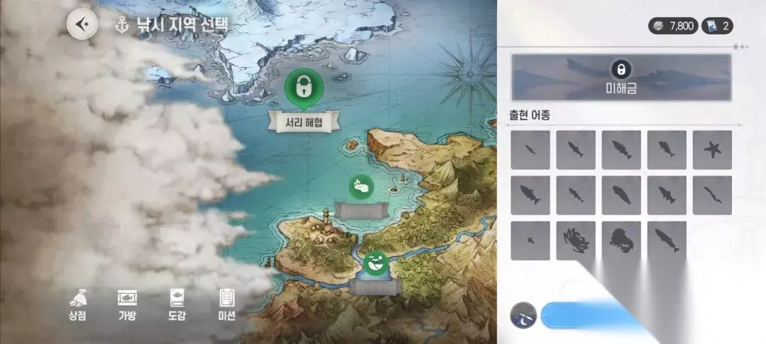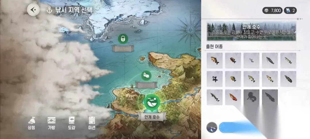 这是选择钓鱼地区的地图,一开放时,会提供3个钓鱼地区。每张地图能钓到的鱼种各不相同,每个地区皆能钓到14种鱼。