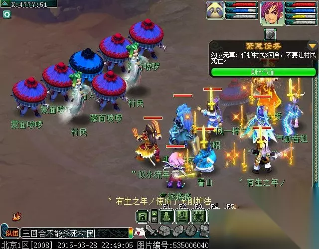 通过民居守卫对话来到村东民居,找龙昭(村东民居(22.8))对话,点热心村民对话。到村外看看蒙面人(干河村(477.51))。点蒙面人进入战斗(战斗难度★★)这场三星以及以上星级的是不用杀的,直接防御就好。三回合之后怪会跑。不用开战。但是一星、二星却是要杀的。