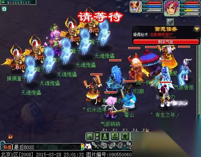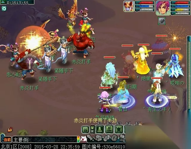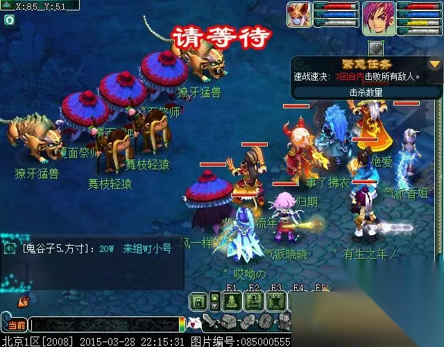 点龙昭进入战斗,(战斗难度★★★)这场不用杀主,主会自己跑。本场战斗,对面的怪比较犀利,以输出为多,后排ST MW SM DF,前排MW WDD WDD SML,另外就是后排的上一,看技能像DF,他却不怎么用DF技能,用破血狂攻的多,而且伤害挺高,BB杀手啊
