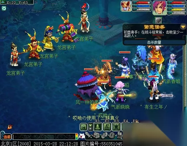 与龙宫弟子坐标分别为(11.69)、(18.68)、(16.62)、(21.67)、(22.65)交谈,进入战斗(战斗难度★)集中杀死一个就可以,其他的会跑。这场战斗没有什么难度,集中点杀一个就好。 值得一提的是: 窗口的右上方出现了一个【紧急任务】:这边先解释一下,在神器任务·转中,3X难度以上神器会出现紧急任务〔1X跟2X是不会出现的)。属于战斗的附加条件,所以对杀法也会多多少少存在着一定的影响,如果每次都能完成紧急任务的要求,那么,在神器结束摇色子时会额外给予玩家额外的经验、金钱和物品奖励,不过,紧急任务如果没有完成,也不会影响神器正常的任务流程,只是没有了额外的奖励。