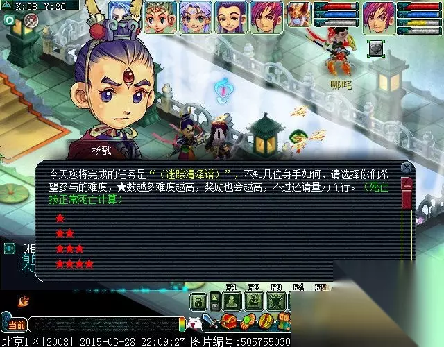我们领取的是神器任务.转迷踪清泽谱。找杨戬(凌霄宝殿55.26)领取任务。在此可以选择挑战的星级,爱恋选择的是★★★,领取时消耗50点(储备)善恶点。找龟千岁(龙宫(109.80))对话,神器开始。