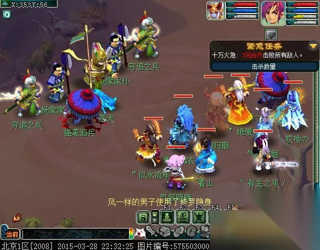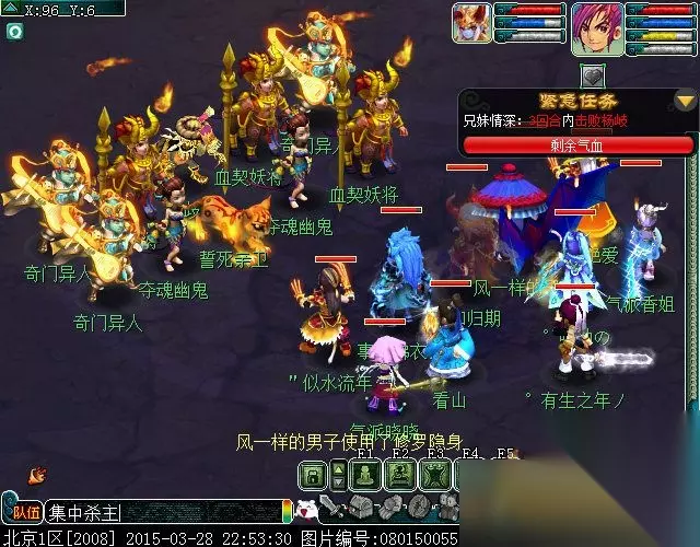 点轩辕(干河村(477.60)对话进入无名洞窟。点杨歧进入(无名洞窟(96.6))进入战斗(紧急任务:三回合内击败杨歧。)可以先集中杀主,豹子会无限护主。本场战斗相对来说是比较难的,后排依次SML LBC ST LG 。SML会单秒、群秒,LBC会群会破血,ST飞机,LG会群秒,会单秒;前排依次TG NE HS NE LBC;TG会封会群秒,2个NE一直是封的,然后HS辅助,LBC输出;所以这场还是要注意队员的血量,注意恢复。(战斗难度★★★★)
