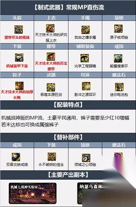 2.MP异常流 【武器推荐】:吞噬本源巨剑 【防具推荐】:望穿尽头的视线+天才上衣+机械下装+天才腰带+天才鞋 【首饰推荐】:黑灵手镯+原子核项链+能量搜索环 【特殊装备】:光学眼镜+脉冲耳环+迷你电池包 【配装特点】:MP出血流,伤害比直伤高,但是墨迹,若有条件的换30%出血伤害自定义上衣,强度更上一层楼