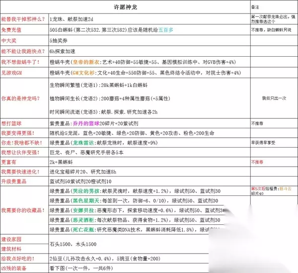 最强蜗牛神龙许愿玩法攻略 一、神龙攻略 龙珠获取途径:抽奖,探索、博物馆1000勋章换、活动(许愿周3600灰烬换)。 每献祭龙珠5次真神龙出现1次(第5*n次出),一共3次。 真神龙出现第一次:大客户礼包(2000白蝌蚪、50k黑蝌蚪、5许愿币)、低等龙晶(100绿试剂、100蓝试剂)。 真神龙出现第二次:大客户礼包(2000白蝌蚪、50k黑蝌蚪、5许愿币)、红龙蛋(孵化巨龙儿孙)。 真神龙出现第三次:红龙鳞(14号器官:移植后,所有巨龙类儿孙防御+10%、获得1800巨龙进化点) 红龙晶(13号器官:移植后,攻击+50、巨龙形态下,攻击+60、获得1800巨龙进化点) 装备:红龙角(攻击+40、敏捷+60;巨龙形态下,攻击+48、敏捷+72) 之后(第16次)献祭一颗龙珠:3*大客户礼包(1000白蝌蚪、20k黑蝌蚪、2许愿币)。 正版神龙出现第2次给红龙蛋(解锁神龙儿孙),把龙蛋吃了,龙妈会上门。 第3次,会被蛞蝓龙暗杀,然后神龙二世会来。 二、神龙许愿奖励一览