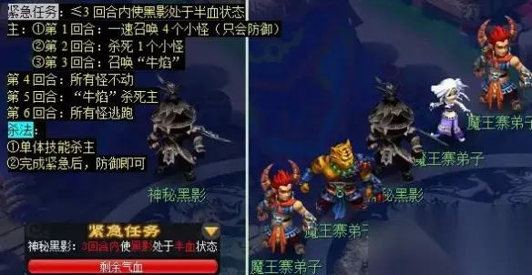 3、打完后对话【牛焰】,去魔王寨(108.22)把【60武器x5】给【江桃妹】; 4、找【牛魔王】(魔王寨门派师傅)对话2次,触发选项;