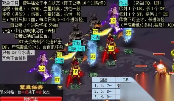 3、火焰山山洞18.26)对话【牛焰】开始“破解封印”; ①前往图中“符文”处,原地站几秒,即可踩亮,有几率触发战斗 ②若遇到“错误符文”,需避开,否则会触发战斗(≥3 人才触发)且需重新踩亮其它 ③此界面尽量不关闭,可移开,就不会遮挡视线。 ④遇到“错误符文”时,可散队,前往“正确符文”处组队,从而避免不必要的战斗 ⑤踩亮“正确符文”并战斗后,可解散队伍换别人当队长。