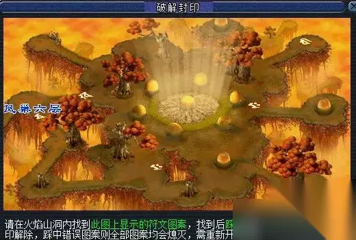 3、在附近找【火焰山山洞入口】传送至【火焰山山洞】; 4、火焰山山洞(11.12)对话【凌雨露】,开始【破解封印】。 ①前往图中“符文”处,原地站几秒,即可踩亮,有几率触发战斗 ②若遇到“错误符文”,需避开,否则会触发战斗(≥3 人才触发)且需重新踩亮其它 ③此界面尽量不关闭,可移开,就不会遮挡视线。 ④遇到“错误符文”时,可散队,前往“正确符文”处组队,从而避免不必要的战斗 ⑤踩亮“正确符文”并战斗后,可解散队伍换别人当队长。