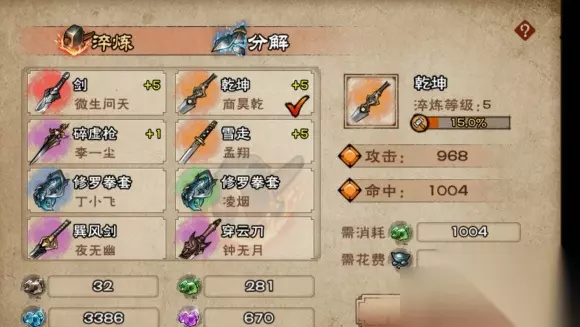 《烟雨江湖》淬炼省钱攻略大揭秘 踏入剑王阁,缓步升阶,智慧先行 初入剑王阁,切勿急于求成。虽然所需石料颇多,但所获属性亦更胜一筹。不妨先尝试一番,或许会有意想不到的收获。淬炼完毕,再行升阶,属性将随等级水涨船高。 两种淬炼方式最终属性差不多 存好绿蓝紫炼石,外加3000体力,再加升阶对应的材料,再花上一定的时间,就可以搞一把附加不错的红剑了